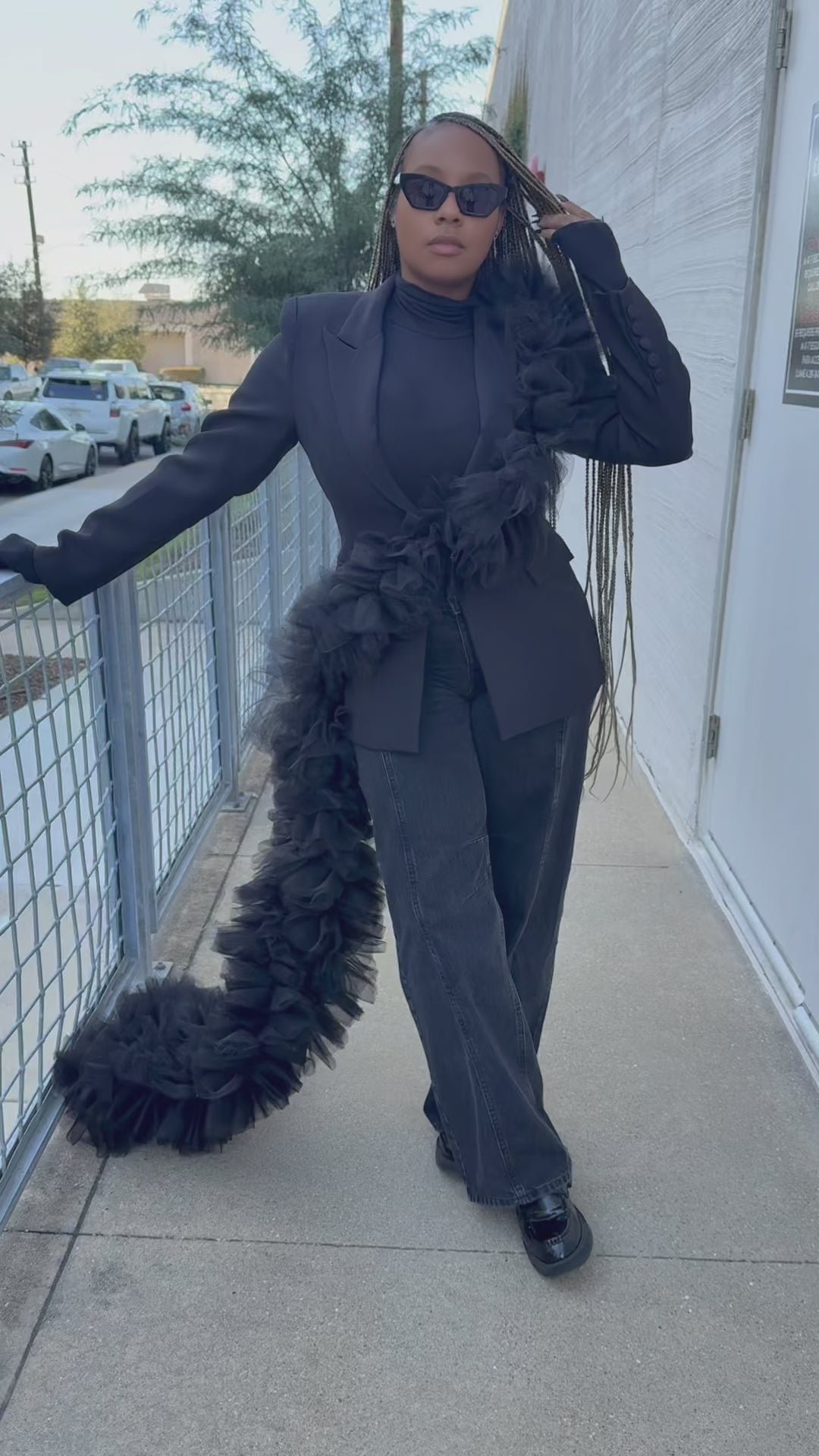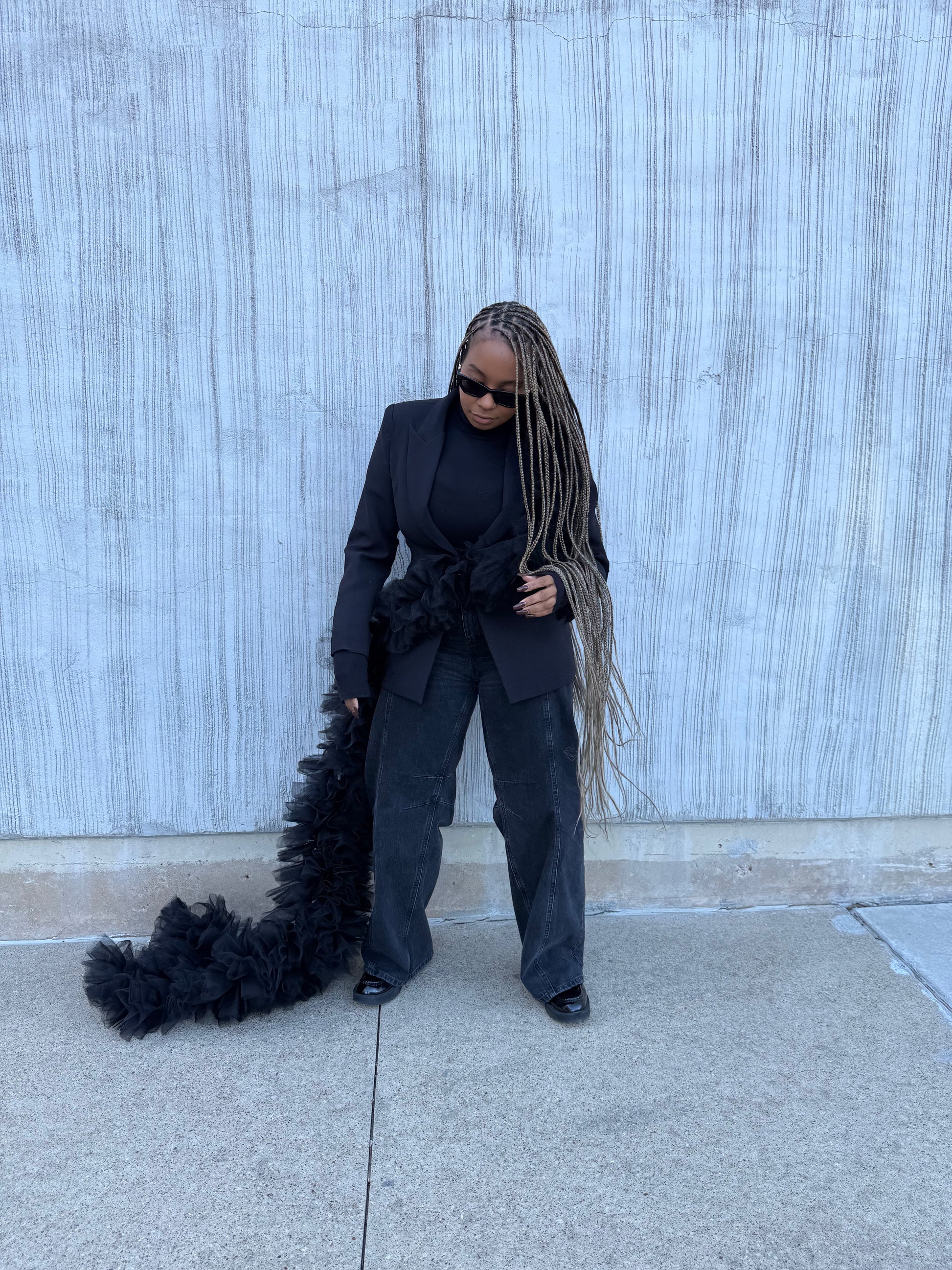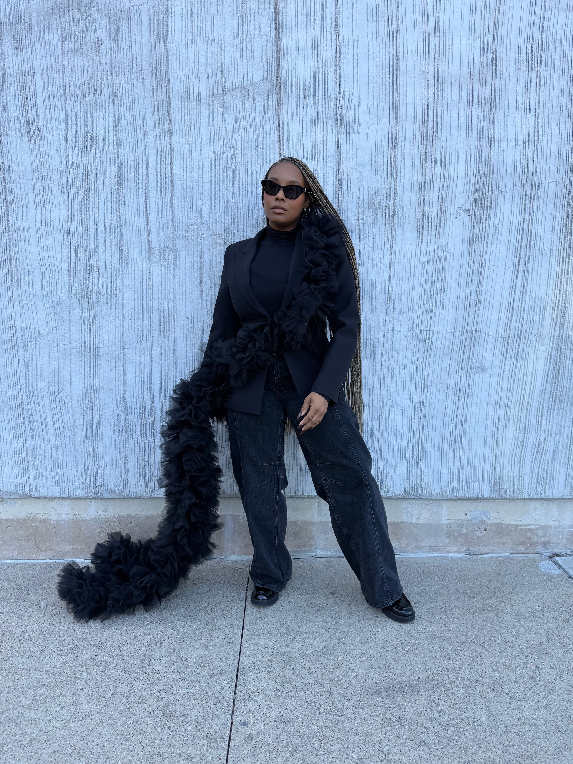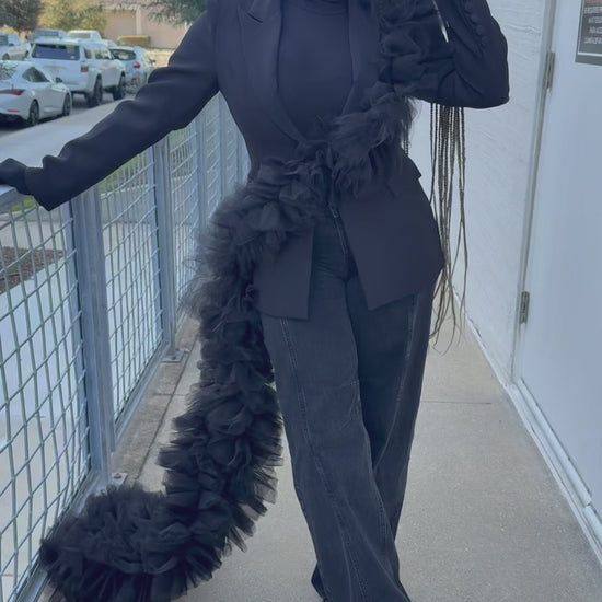 Crafted in a rich black, this suit radiates confidence, presence, and high-fashion edge. The sculptural tulle adds softness and fluidity while still delivering maximum impact, perfect for women searching for a statement black suit for galas, special events, photo shoots, leadership moments, and milestone celebrations.