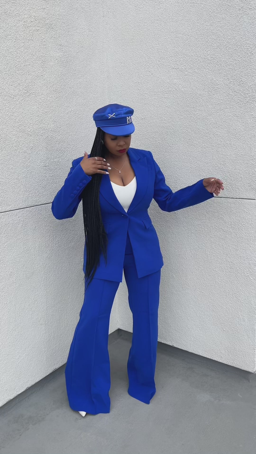 Introducing our stunning electric blue women's pants suit, a perfect blend of bold elegance and modern sophistication. This eye-catching ensemble features a tailored blazer and matching pants, both designed for a sleek and flattering fit. Ideal for making a statement at the office or any special event, this suit combines vibrant color with classic style for a truly unforgettable look.