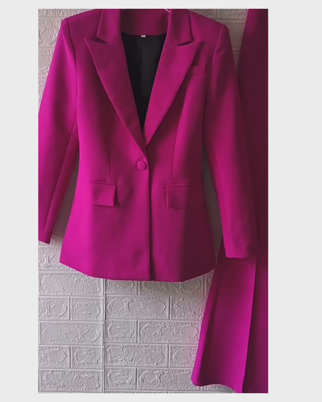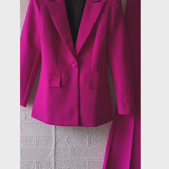 Introducing our stunning magenta women's pants suit, a perfect blend of bold elegance and modern sophistication. This eye-catching ensemble features a tailored blazer and matching pants, both designed for a sleek and flattering fit. Ideal for making a statement at the office or any special event, this suit combines vibrant color with classic style for a truly unforgettable look.