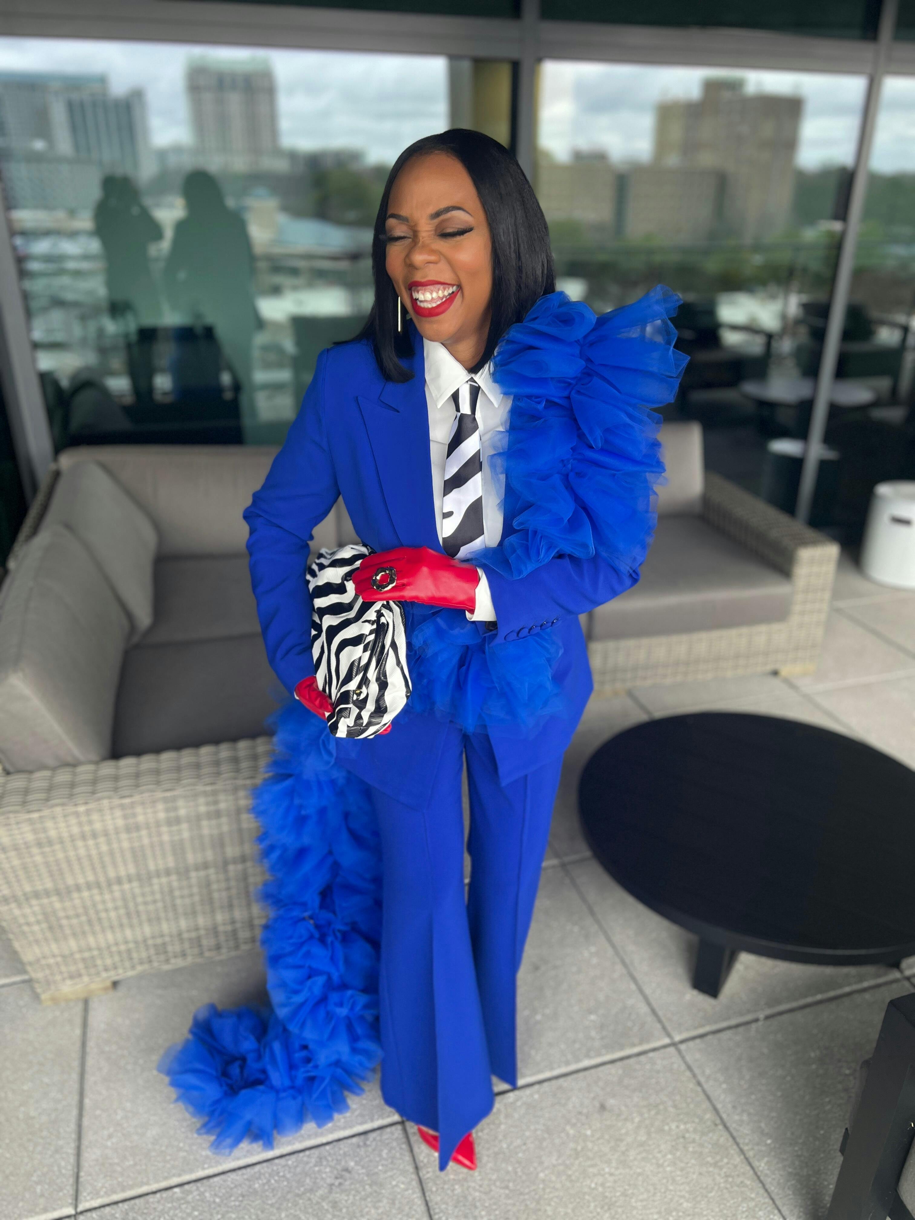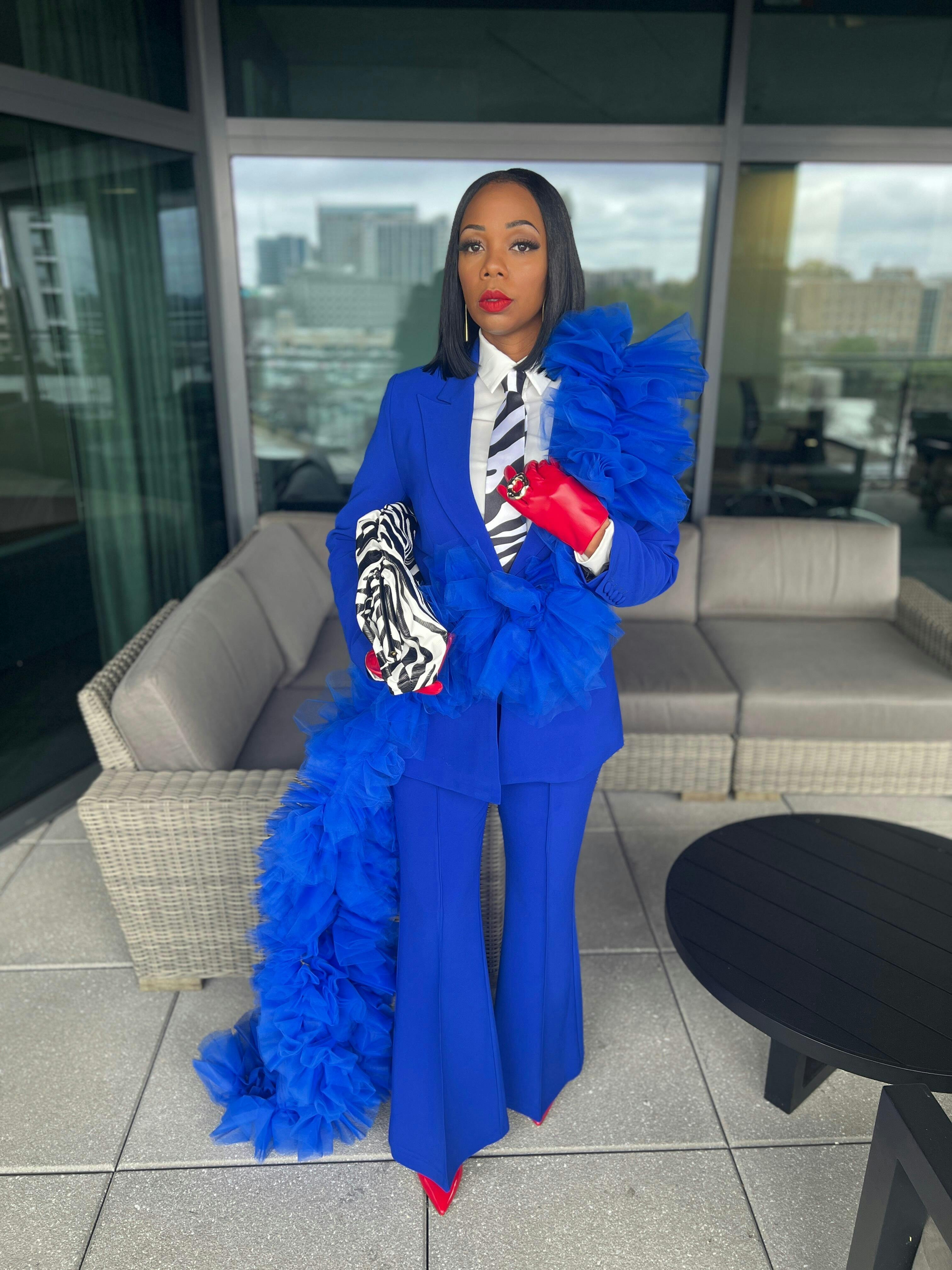 Crafted in a rich royal blue, this suit radiates confidence, presence, and high-fashion edge. The sculptural tulle adds softness and fluidity while still delivering maximum impact, perfect for women searching for a statement red suit for galas, special events, photo shoots, leadership moments, and milestone celebrations.